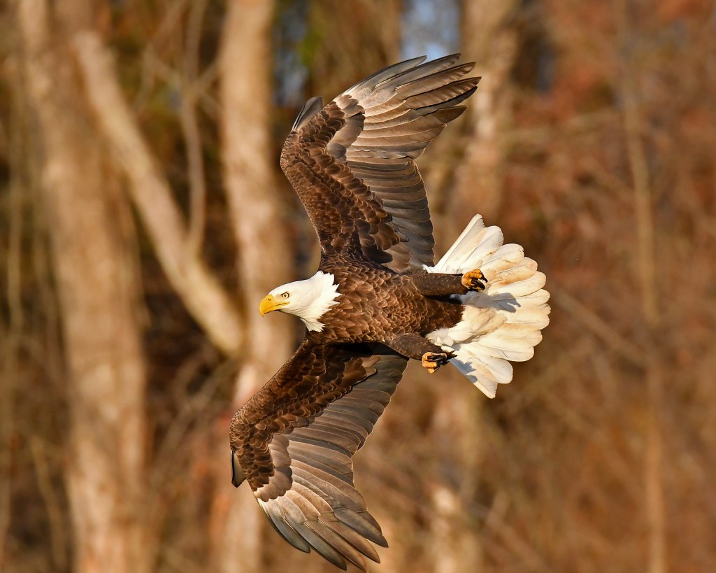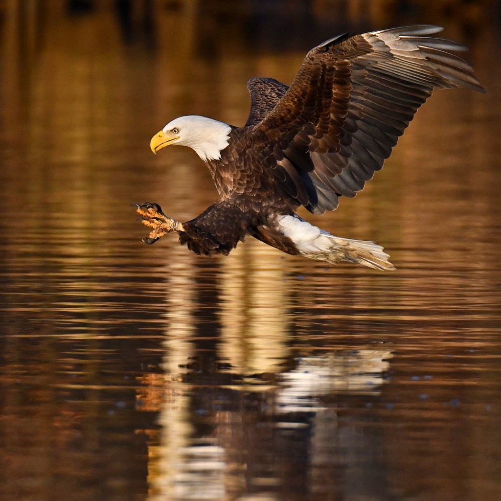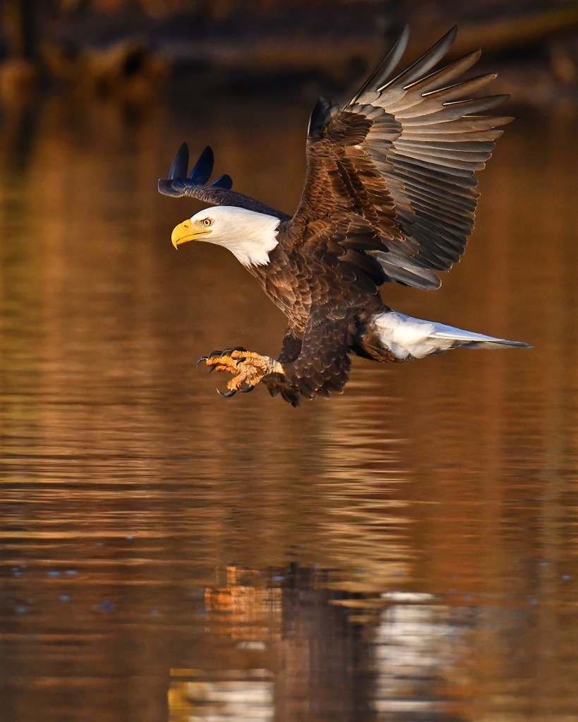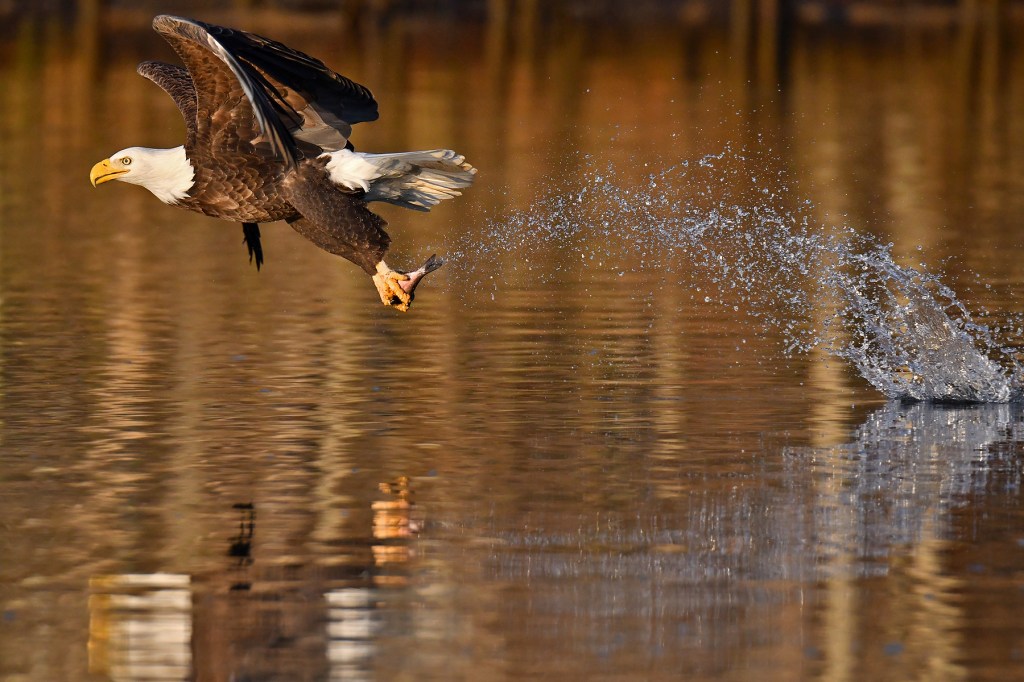 It’s 7 AM and 28 degrees as I board the weather worn , 24 ft fishing boat that will be taking me through about 5 miles of bald eagle territory along the James River just outside of Richmond, Virginia. I crack open a couple handwarmers and stuff them into my gloves as we prepare to witness the greatest comeback story of the bald eagle in the entire North American continent. Forty years ago there were none. Today, over 280 pair of bald eagles call the James River Watershed home. Myself and 5 others will be passing through the territories of 5 resident pairs and also some migrants from up north who spend their winters here because of the abundance of food and a river that doesn’t freeze. I’ll spend about 4 hours on the river this morning but it only takes about 15 minutes before I hear the call from Captain Mike; “bird out, 2:00 “. I look up, and there he is, swooping in from his perch along the banks and diving directly in front of the boat about 40 yards away. Even though it’s a beautiful, calm morning, the gentle rocking of the boat and the ridiculous speed of the diving bird makes it extremely hard to keep my subject in frame. But I manage to lock on and fire off a burst of shots as he swoops in to grab breakfast in the golden morning light.