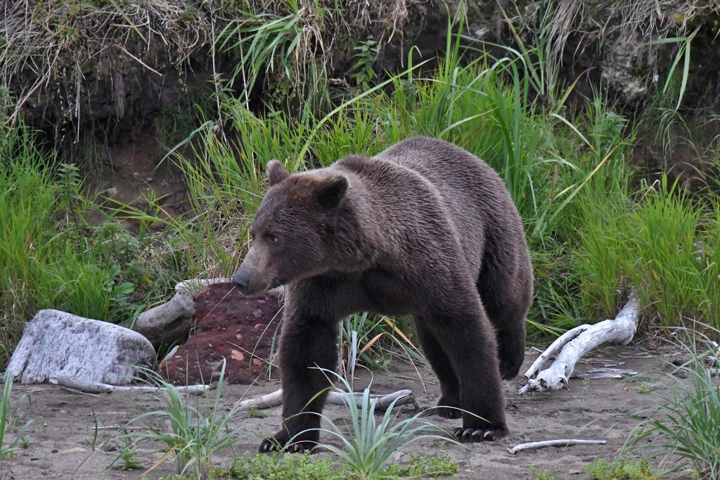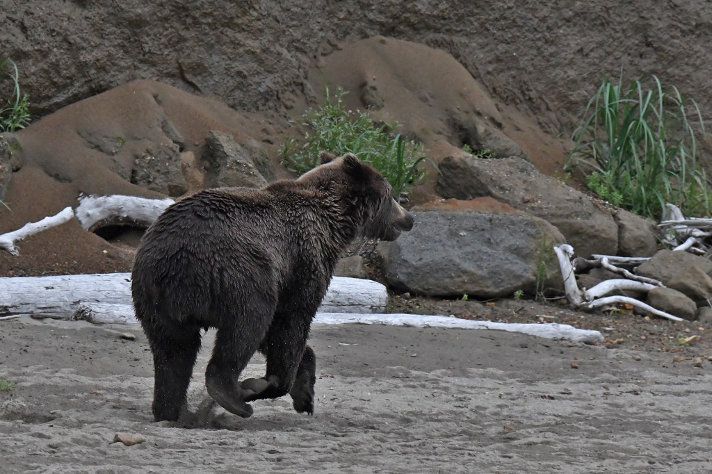But all we could do was stand there, as usual, and watch as he lumbered away off to our right. And now he had the attention of a smaller bear that had found a dead salmon in the shallows of the creek. As he slowly approached the youngster, the bear dropped the fish and scurried away along the creek bed and out of sight.