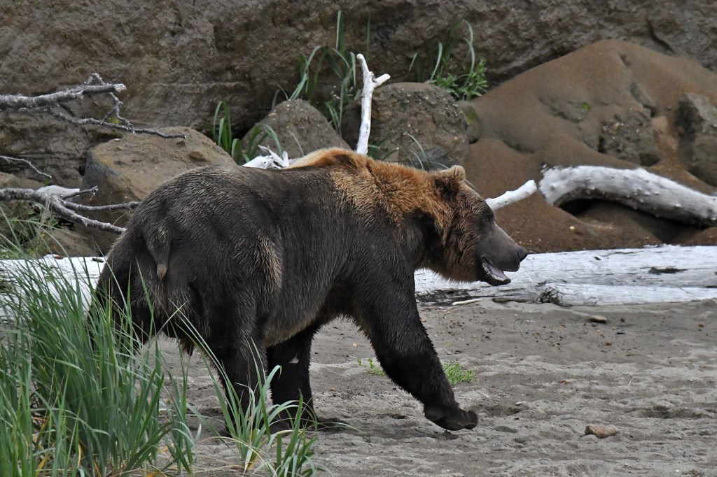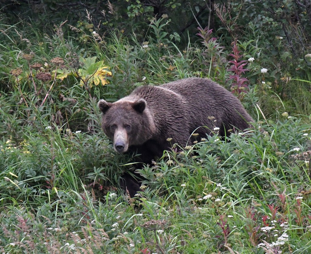And stranger yet, I hadn’t given any thought to that story, until the 5th day of this trip, out alone one evening with Lance, one of my guides. It was very rare to spot an animal before Lance did. He would point out a wolf resting in the tall grass 100 yards away and I’d have to strain my eyes and follow his directions to finally locate the animal. Maybe he was distracted this evening, or maybe just a little less cautious because he only had me to worry about, but I spotted the bear first, and told him immediately, ” Lance ! bear, and this guys looks different”. “Oh yeah”, he said, “that’s a big bear”. Most of the bears we had seen up to this point were estimated to be in the 500 to 700 lb range, by no means small animals, but this guy looked menacing. The way he carried himself, his sheer size, the battle scars, suddenly Timothy Treadwell was playing in my head. I just didn’t feel comfortable the way he was looking at us.