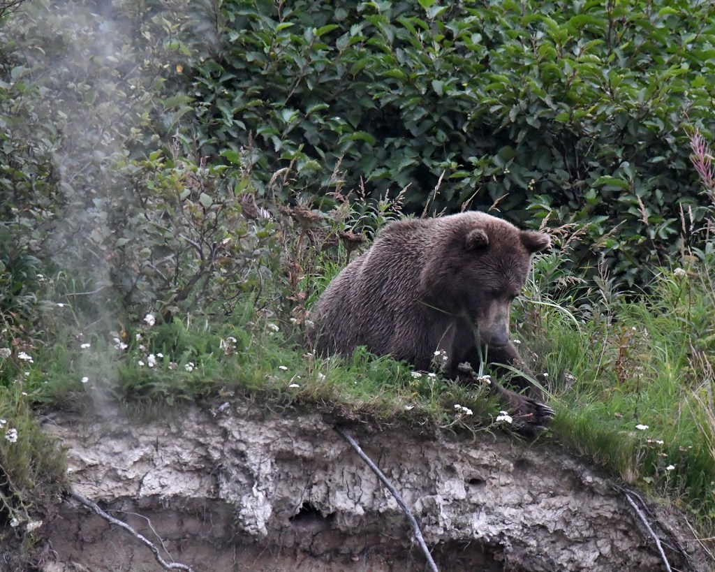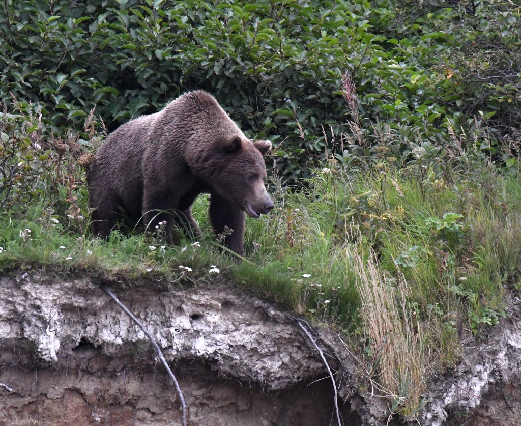Lance was just laughing, amused by the fact that this younger bear, which had just been chased off, was now taking an aggressive posture from the relative safety of a 100 foot cliff. “Look at him acting all tough up there”, he said. There was no way that big, old bear was going to make the trip all the way up there to bother with him. And he didn’t even look up as he slowly made his way downstream. After a few minutes of this, we saw the smaller bear make his way down the opposite edge of the oxbow to our left. He peeked out of the brush, and after checking to see if the coast was clear, grabbed the salmon he had dropped, and took off running in the opposite direction the larger bear had gone.