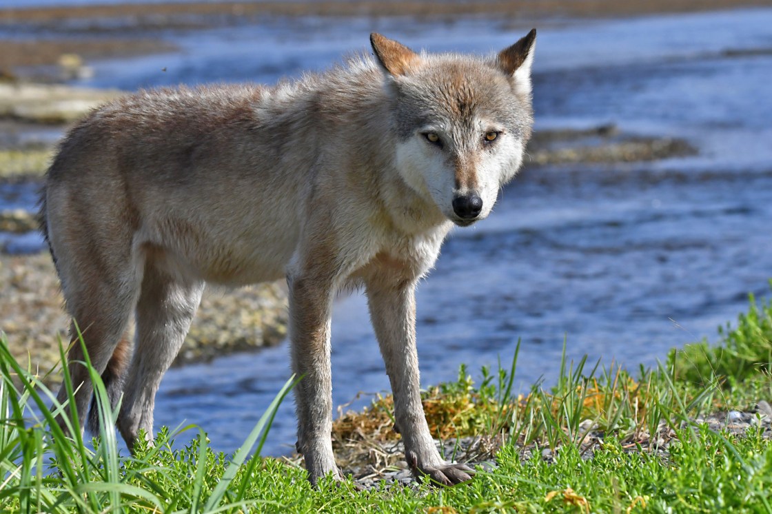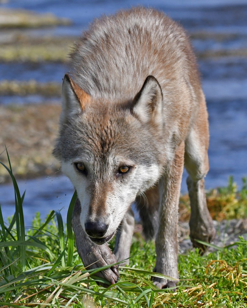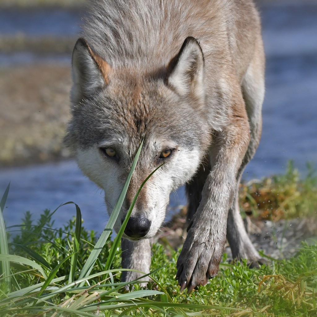 I was kneeling behind my tripod and tracking this Coastal Gray wolf as it approached, closer and closer. I had no idea what it was up to with this slow, creeping posture.