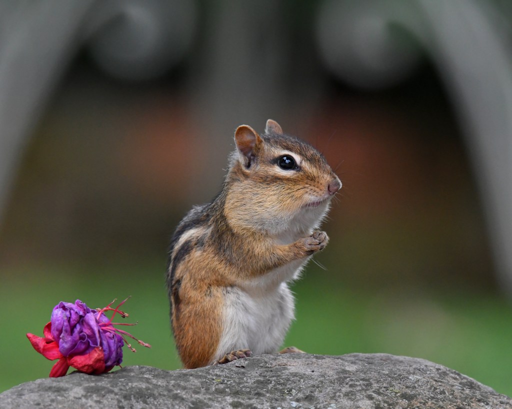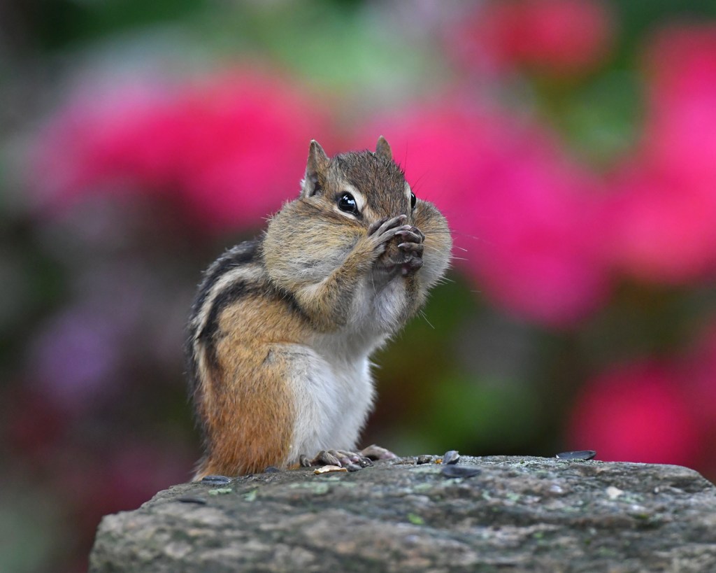 A chipmunk’s cheek pouches can expand to 3 times the size of their head. I have no idea how many sunflower seeds that would be. I find that if I lay down on my stomach they eventually will ignore me and it also gives a much more intimate perspective.