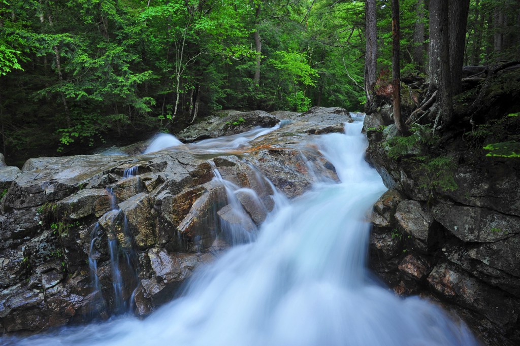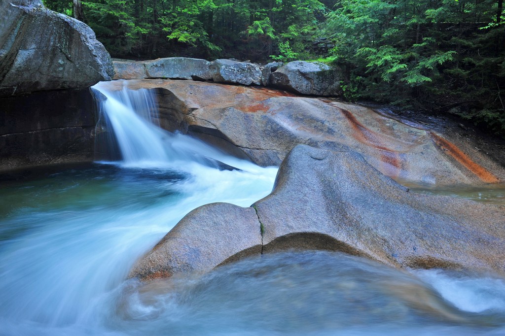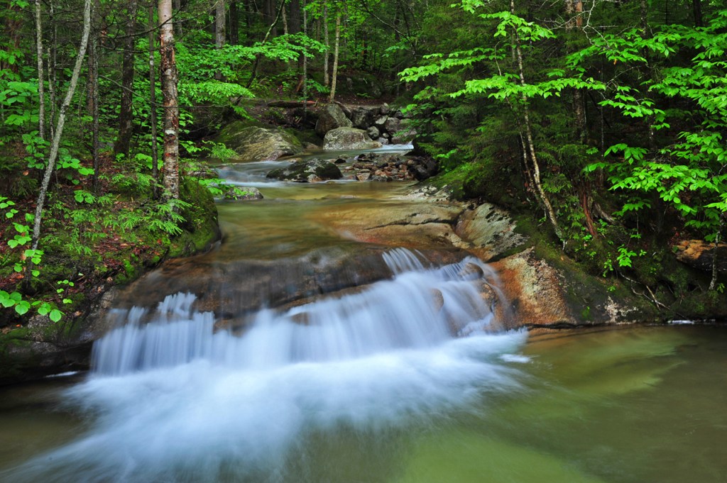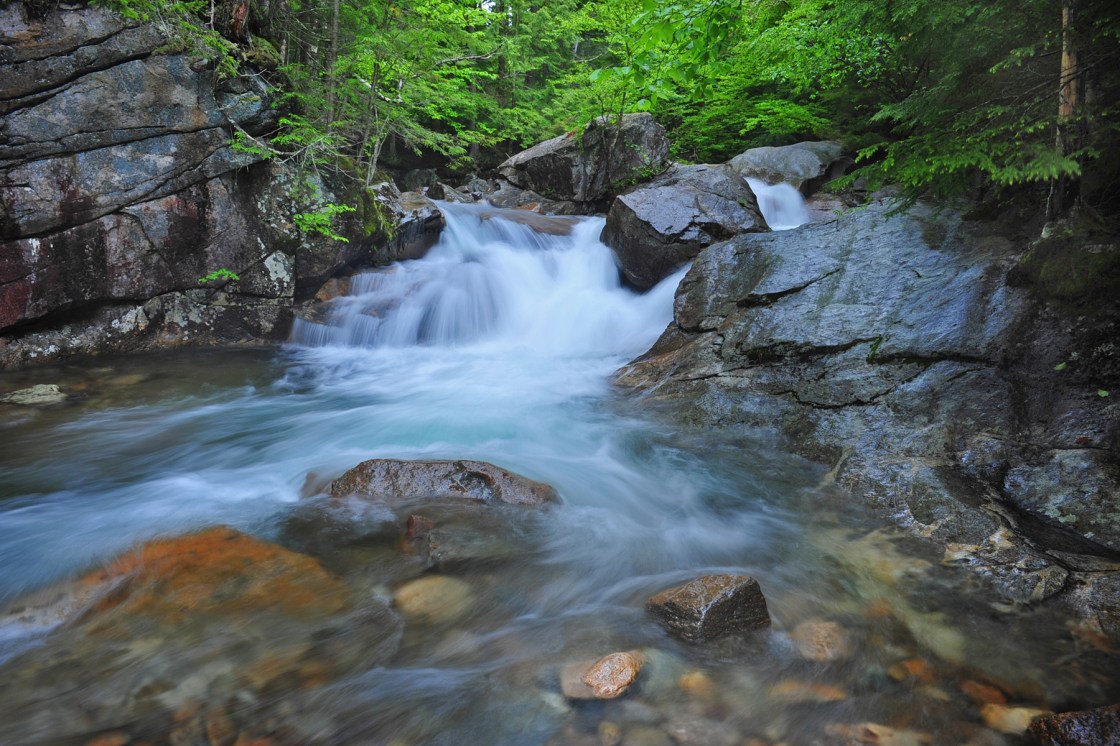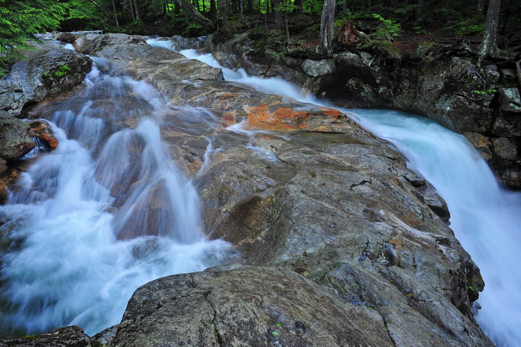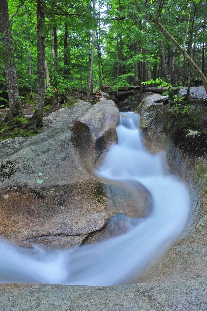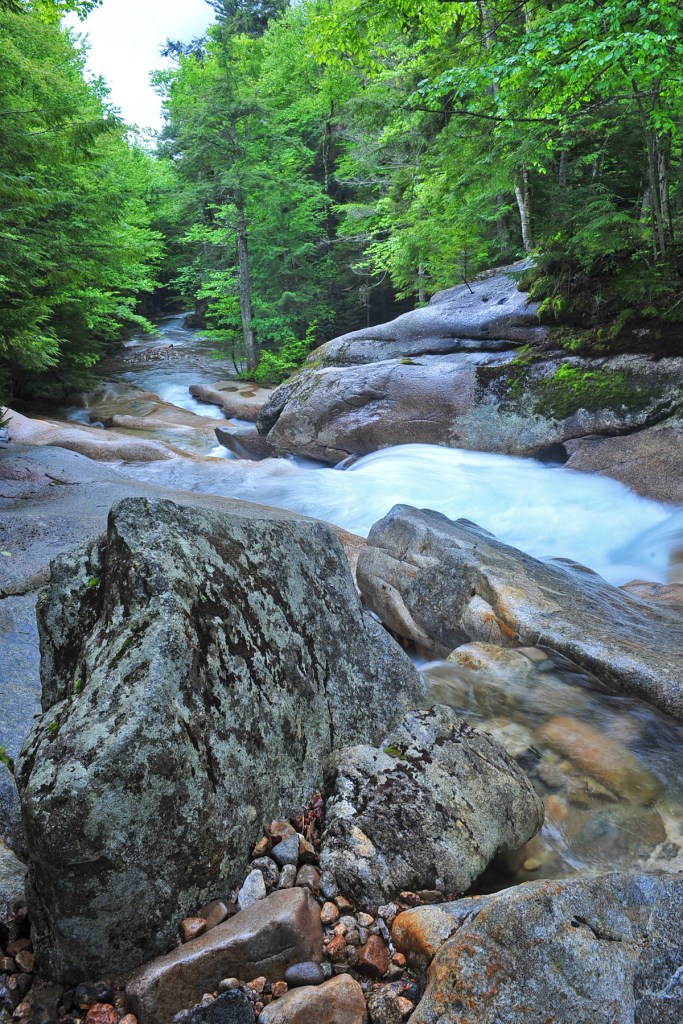 In June 2012 I was on my way to Baxter State Park in Maine to photograph moose. My original plan was to drive straight through but I was getting tired after about 10 hours so I pulled out my road atlas and found Franconia Notch State Park in New Hampshire. I had a blow up mattress, food, and a cookstove in my van so all I needed was a campsite. It was mid afternoon and I found a trail nearby so i decided to scope out any photo opportunities. The short trail led me down to this beautiful river but the harsh afternoon light was not very pleasing, I decided I would need to be back here before the sun hit the water in the morning.