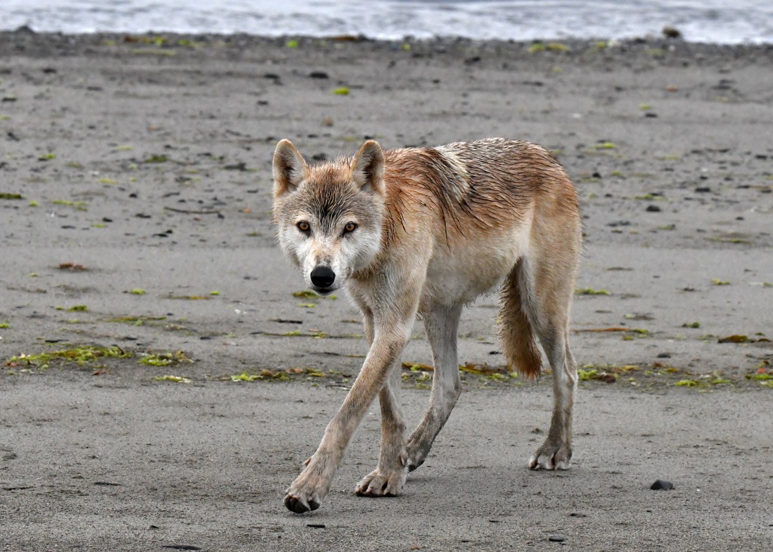 My attention at the moment, however, is focused directly on the creature making it’s way up the beach and heading directly for our camp. He’s trotting up the beach now and stops directly in front of me about 30 feet away. Our eyes meet and we both just stare. I can’t believe I’m looking into the piercing eyes of a wild Gray Wolf. And there’s nothing but sand and space between us. I was certain that I’d see my share of bears on this trip, but I only dreamed I might catch a quick glimpse of a wolf. He just stands there, staring, assessing me. Sizing me up maybe ? I feel that he’s looking at me but also right through me. No fear, no aggression, no apprehension that I can detect. Giving off no signals at all aside from total confidence. And I feel a strange mix of the unknown and the familiar. Like an extremely large dog has just wandered into my yard and I’m trying to determine if he’s dangerous. Nick Jans, in his novel ” A Wolf called Romeo” gives this insight; ” The true measure of distance between wolves and dogs lies in the eyes. A dog’s may display intelligence and engagement, but being caught in a wolf’s unblinking gaze is like standing in the path of a laser. That startling intensity bores in and seems to take the very measure of your being”. He seems just as curious in me as I am in him. And just as easily as he approached, he turns and saunters off. Leaving me in awe, spellbound. Endless fodder for future dreams and nightmares.