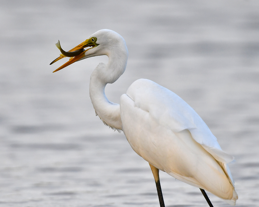 This Egret has been feeding on this small local pond for about three weeks. I’ve probably spent over 20 hours observing and photographing him stretched out over 5 different evenings. The thing I found remarkable and also confusing was how tolerant he seemed to be at close range. I’m certainly no expert but I’ve been chasing after Herons and Egrets for over 10 years now locally and in places like Florida and Virginia and I’ve never seen a bird so undisturbed by my presence. They’ll usually flush out if I try and get within 100 yards of them. I’ve found the birds in Florida to be the most approachable but nothing like this guy. If I sit on the bank of the pond, either kneeling or sitting on a bucket, he’ll land 15 feet away from me and just go about his fishing as if I’m not even there. My first thought was wherever he came from he was being fed. But that didn’t seem to make sense either because if that was the case he would most likely touch down on land and at least linger around me for a bit to see if I’d give him any handouts. But he lands in the water and then just goes directly to fishing and will sometimes walk back and forth in front of me about 10 feet away as if I’m not even there. Even if I move around a bit slowly to change position, the bird is not bothered. However, if I or anyone else, it seems, walks anywhere near him, even from a distance, he will take off immediately. It occurred to me last night, this bird spends a lot of time with the geese that are full time residents on this pond.