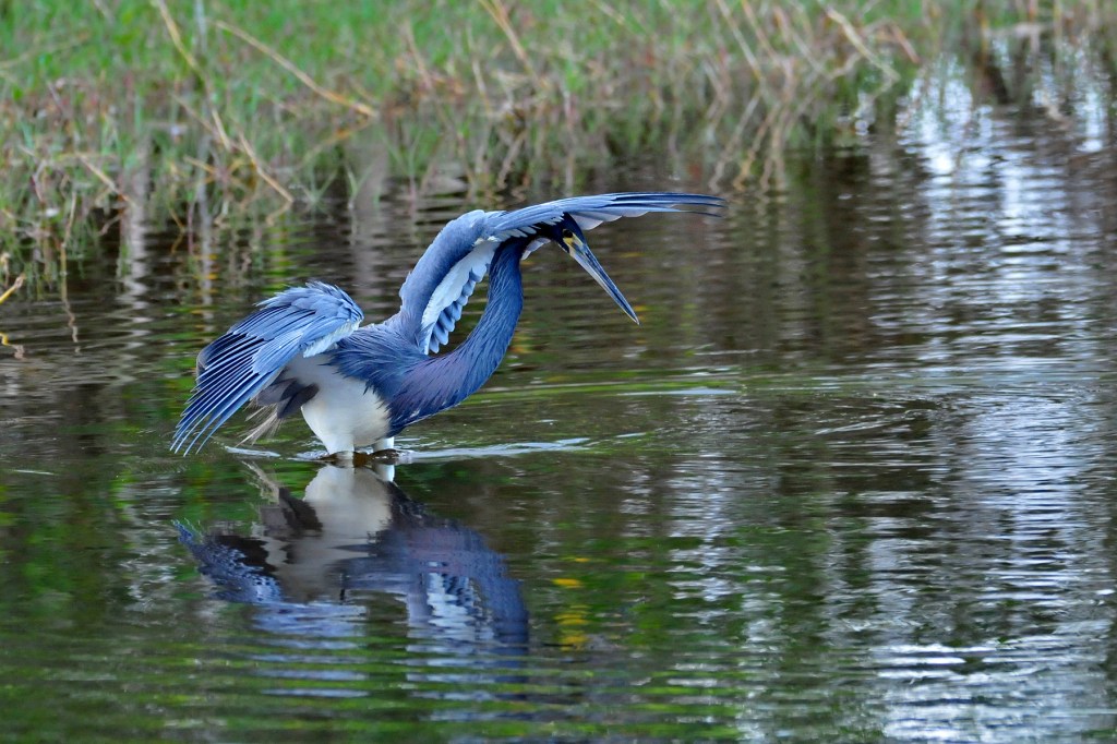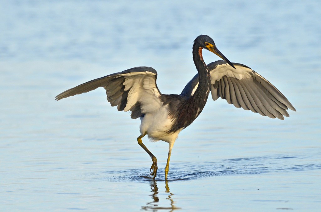 This is fairly common behavior in some egrets and herons. The strategy involves shading the water with outstretched wings. Small fish may then possibly seek refuge from the sun and swim into the shade provided by the wings. A Tri-colored Heron at Fort DeSoto State Park in Florida.