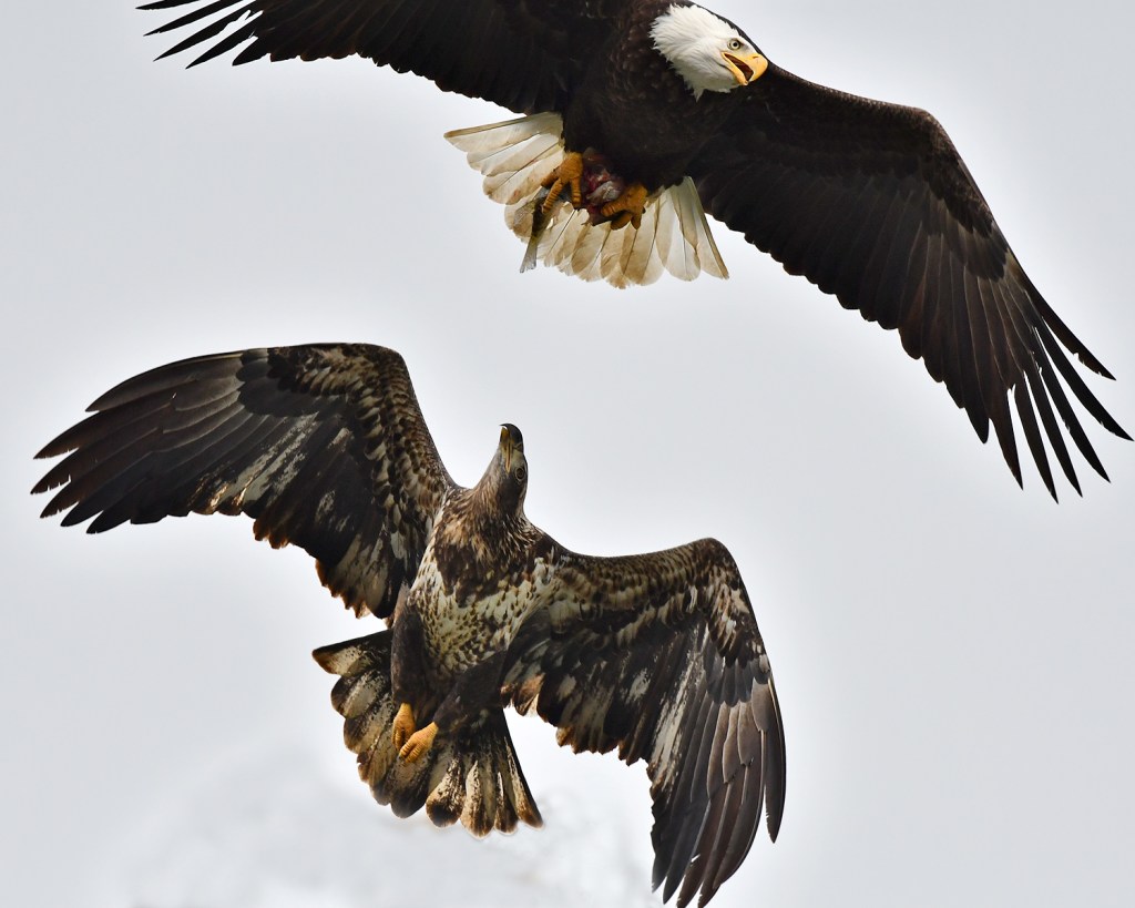 While Osprey are primarily solitary birds, Eagles tend to congregate in large numbers near an abundant food supply. This is especially true for northern birds in winter months. This poses a unique problem brought on by the birds themselves. Eagles are notoriously lazy predators. It seems they prefer to let someone else do the work and then they swoop in and go for the steal.