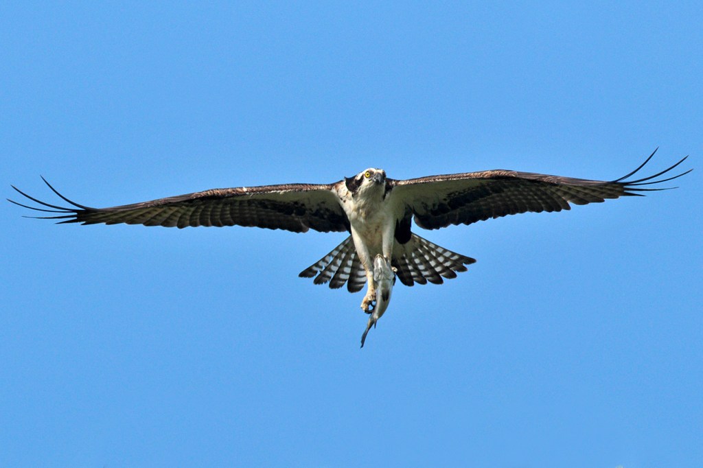 When Osprey carry their prey, they always re-position the fish so that its head faces forward in a streamlined position for transporting through the air.