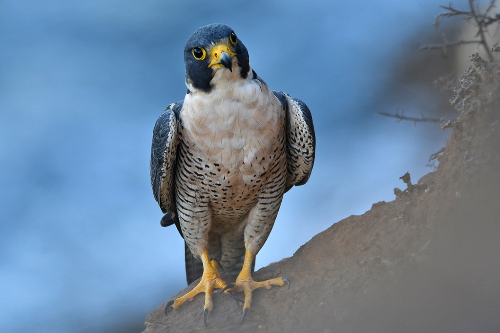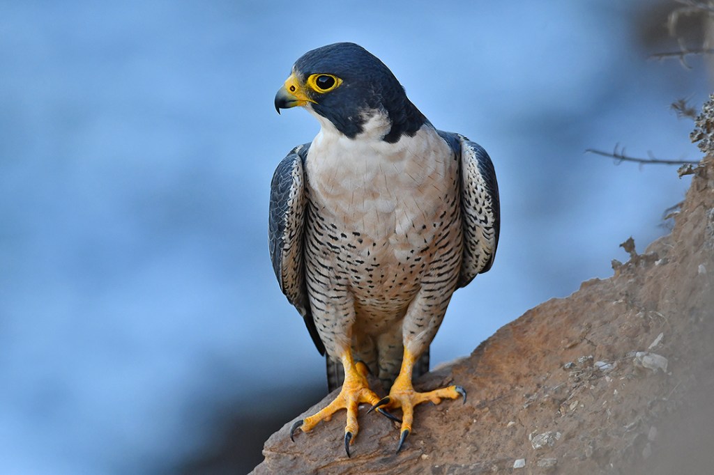 Peregrine Falcons nest on cliffs up to 1300 feet high. Their typical prey includes shorebirds, ducks, grebes, gulls, and pigeons. They are one of the world’s fastest birds; in power-diving from great heights to strike prey, the Peregrine may reach 200 MPH.