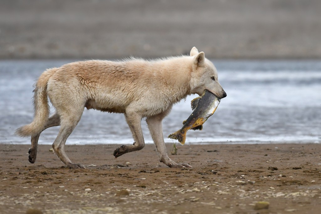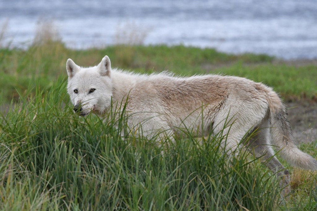 Two of the best outings from my Alaska trip were the evenings the other three in our party decided to stay in after dinner and I was able to go out alone with either of the two guides. Enjoying the company of the other three guests and wandering through this wilderness was already more than I could have hoped for but now just down to the two of us it was beyond enjoyable. The conversations turned a little more intimate and the experiences a little wilder. Jerry and I were watching a coastal gray wolf fishing for salmon from about 75 yards away. He came up with his catch on the first try,