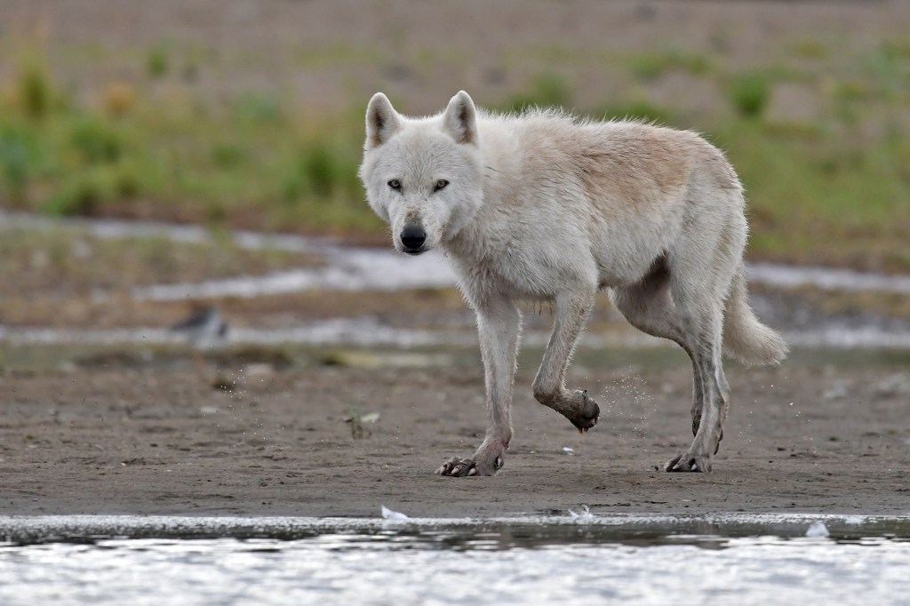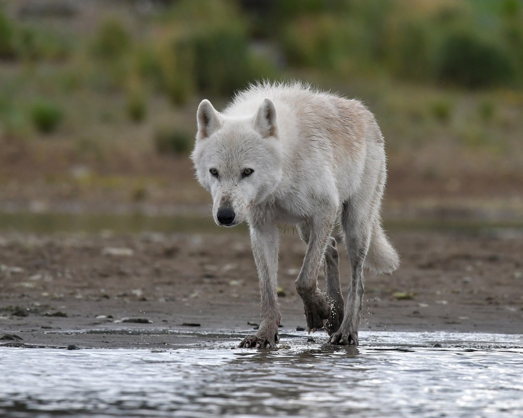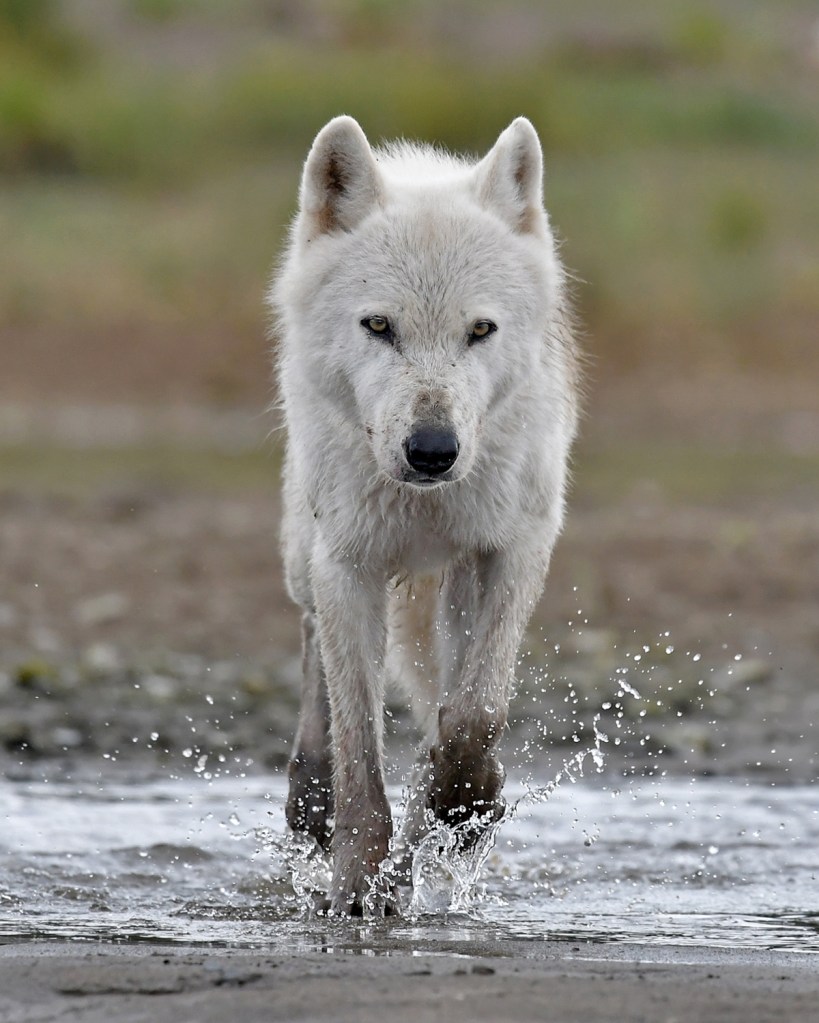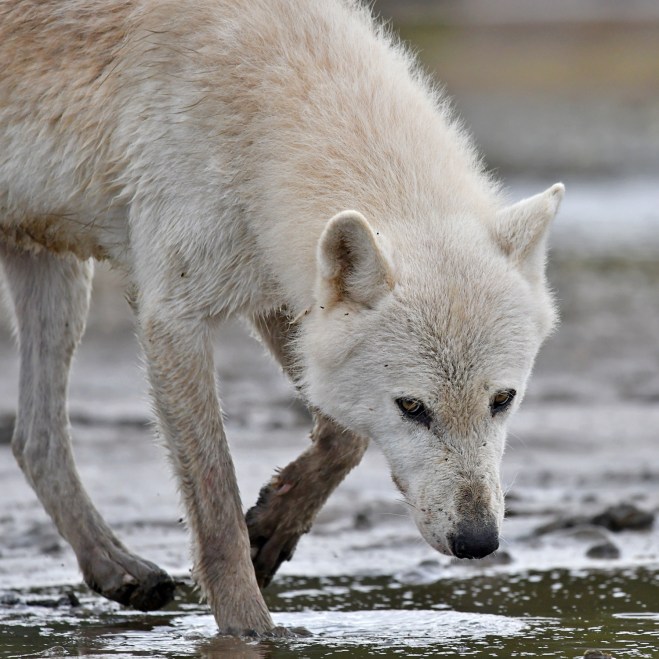 We watched as he came to a halt a mere 15 feet away. A beautiful animal, all white with glowing, yellowish-green eyes, his head clearly taller than my belt line. Jerry had a flare gun that he kept on his belt but it was only to be used in extreme situations and he had yet to test it’s effectiveness on wolves. So we both stood there, holding walking sticks, and wondering what the wolf’s next move would be. I remember a feeling of detachment from my body at this point. Not in any sort of a mystical way, just as if it wasn’t really me standing there. As if I were looking down from above at this strange triangle; an inquisitive wolf, a guide who admittedly had limited experience with wolves, and an old man who had never felt so far removed from his home. I had no frame of reference for this type of experience and the fact that we were so alone with this unpredictable animal and with barely any protection left me feeling exposed and more than a little nervous, but oddly enough, not really afraid or threatened. In fact, I had this overwhelming urge to reach out, to offer a hand as you would a dog. There was a pull of familiarity, a kinship of sorts. But the confidence of this animal was no doubt alarming and intimidating and I began to feel confused, helpless. It was as if he knew he was in charge of the situation. He was calling the shots and we would only be allowed to walk away when he was ready to let us walk away.