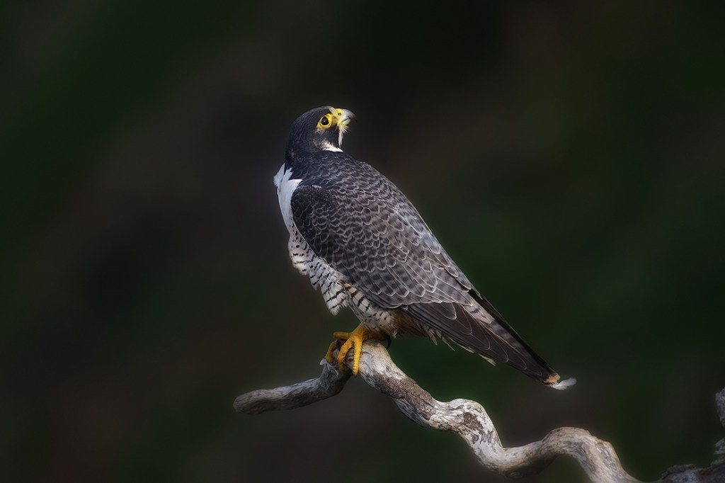 I was watching this female falcon for quite some time through the viewfinder along with six or seven other photographers. It had been an overcast morning and I noticed the light starting to change. The sun was suddenly hitting her pretty hard calling for faster shutter speeds in order to preserve the highlights. This underexposed the background which was the cliff face covered in green from the previous rains. The light then started to fade just as she flew off (in the wrong direction) to another perch about 100 yards away. I lowered my camera and turned around to see that I was all alone. Then I saw the wall of rain starting to blow in off the coast that sent everyone running for cover. I made my way down to the other perch to grab a few shots and then left her to sit out the rain.