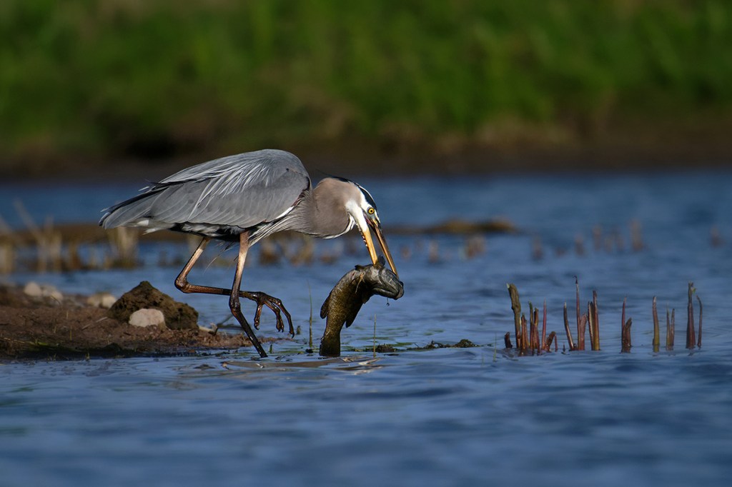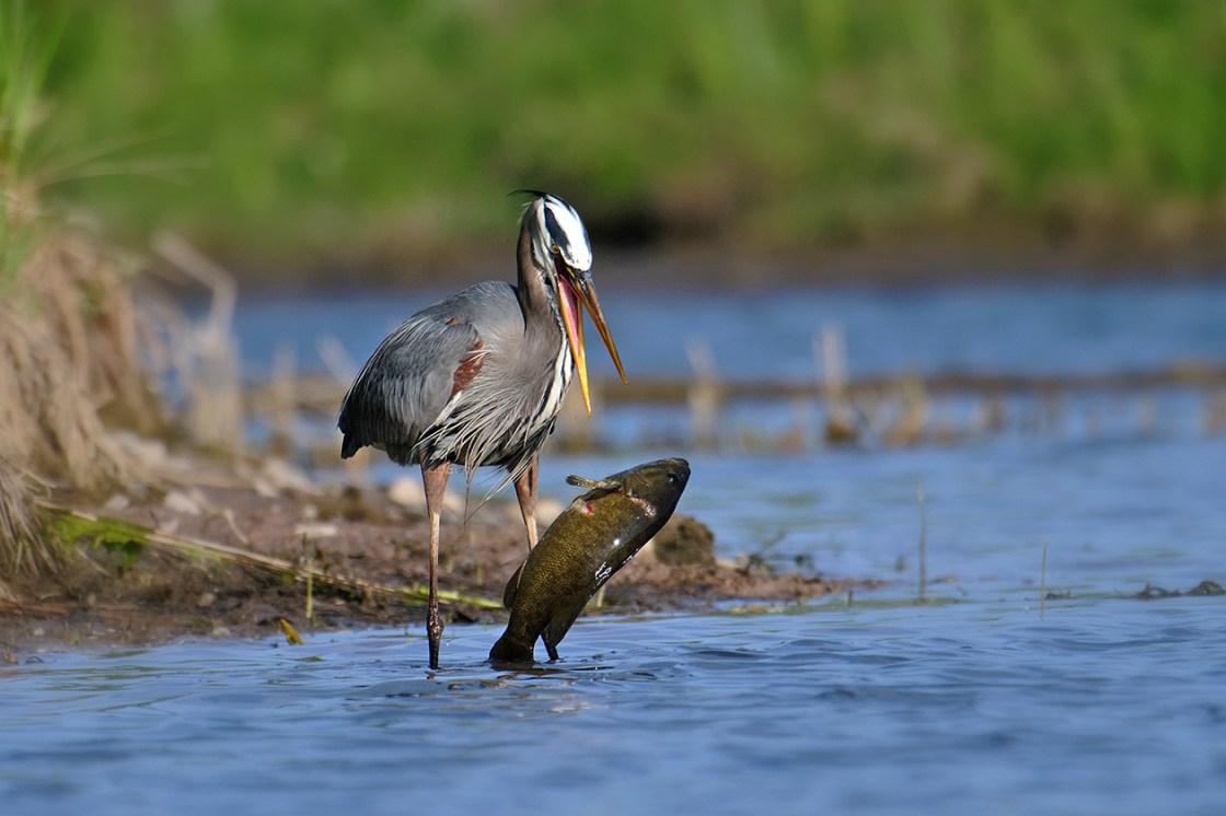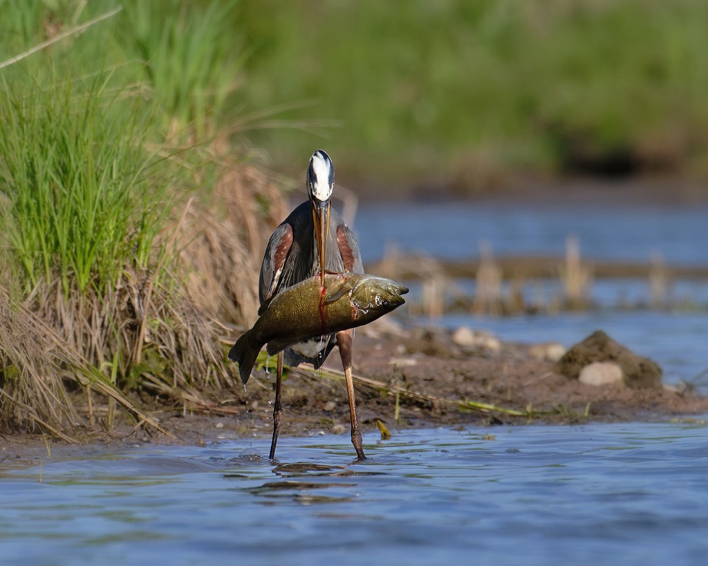 I watched this Great Blue Heron try to swallow this Small-mouth Bass a couple of times with no luck. These birds have been known to actually choke to death trying to swallow prey that is too large. I don’t know if he was ever successful as I backed off feeling I was making him nervous and I didn’t want to stress him out.