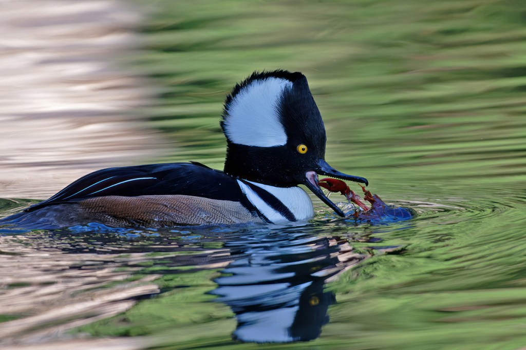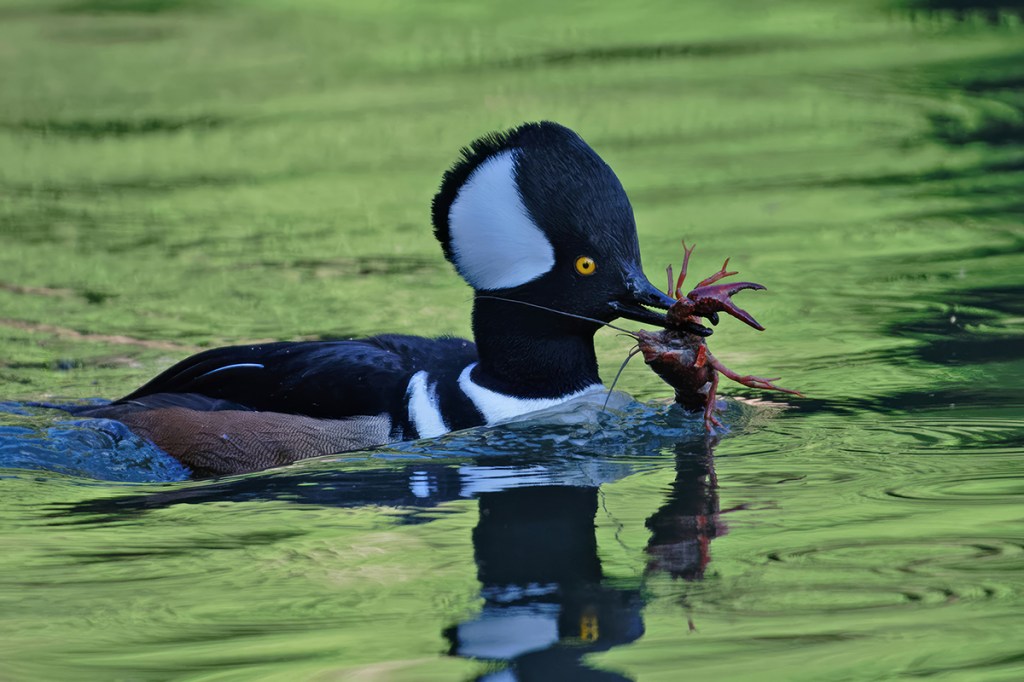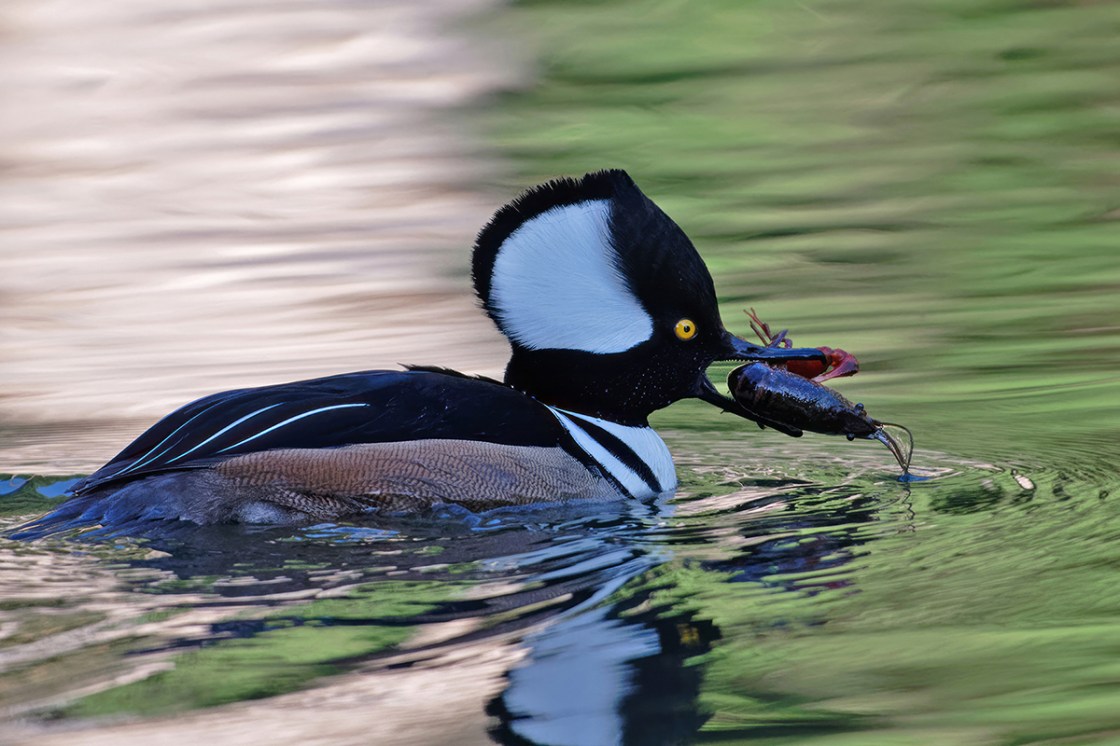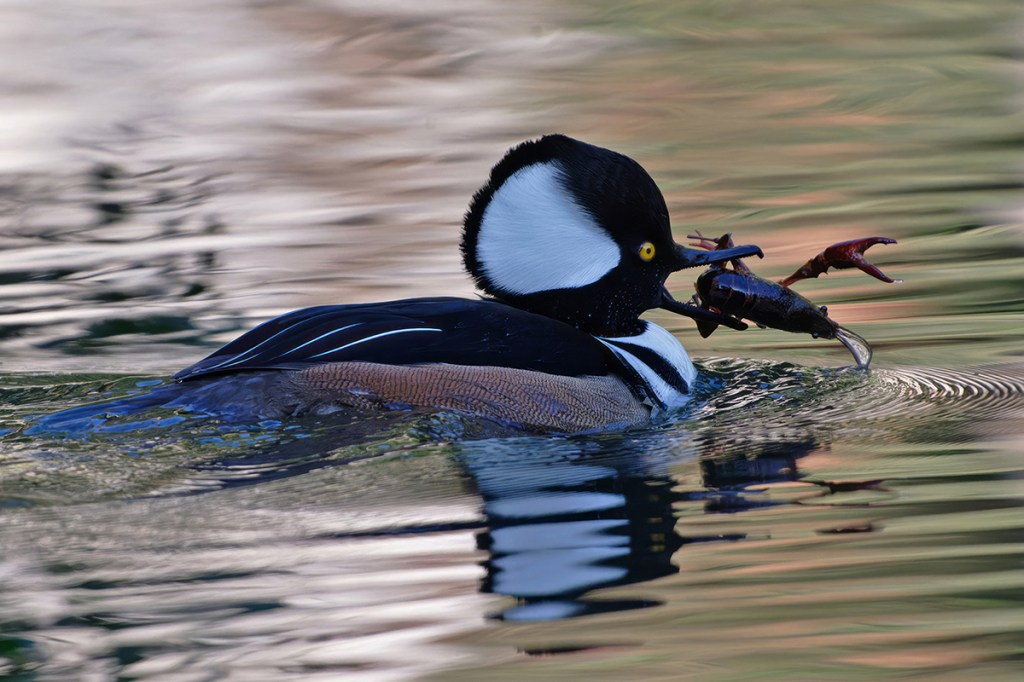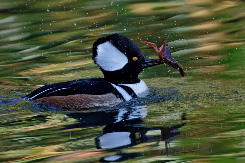 I was focusing on a Green Heron at Baldwin Lake in Arcadia, CA when this male Hooded Merganser popped up from under a snag just off to my left. Thankfully he passed in front of me for a few seconds while trying to get his catch under control before swimming away.