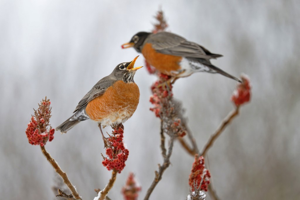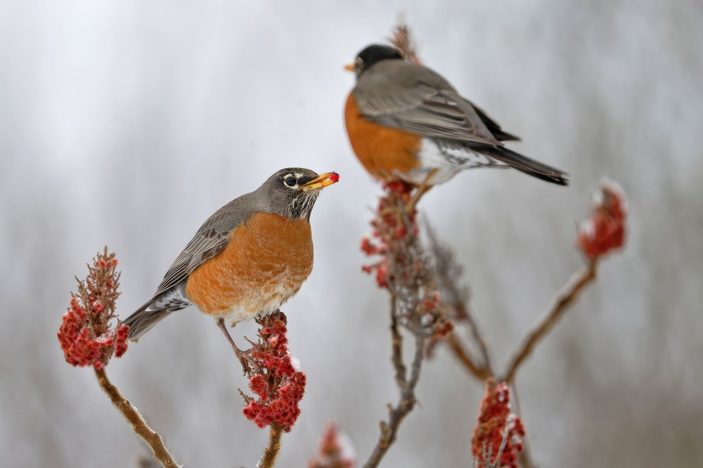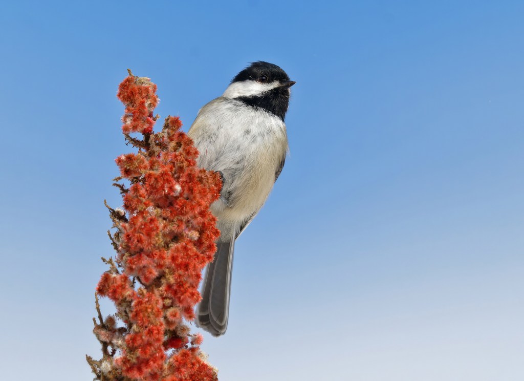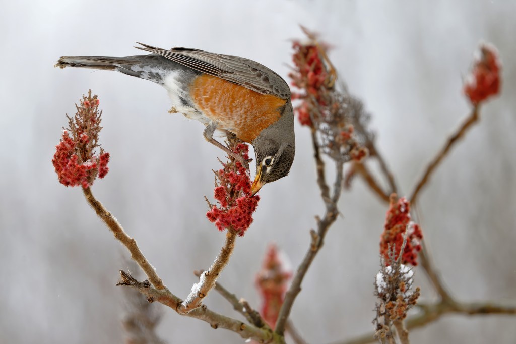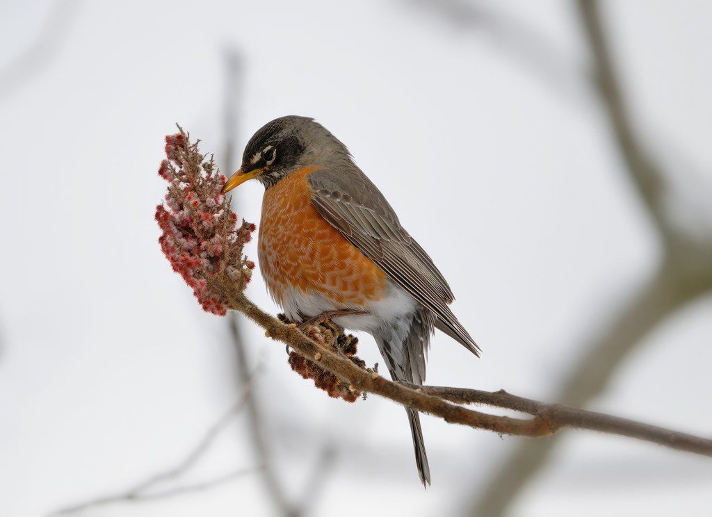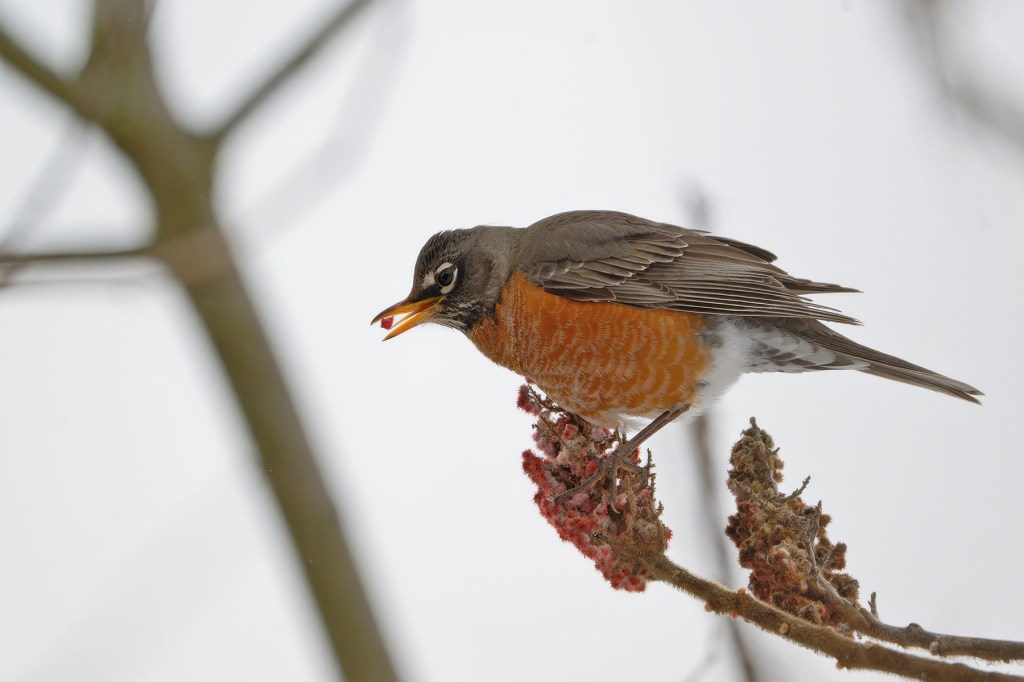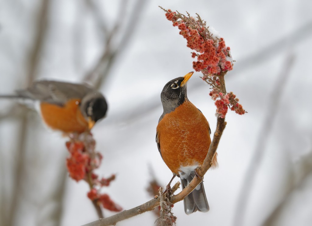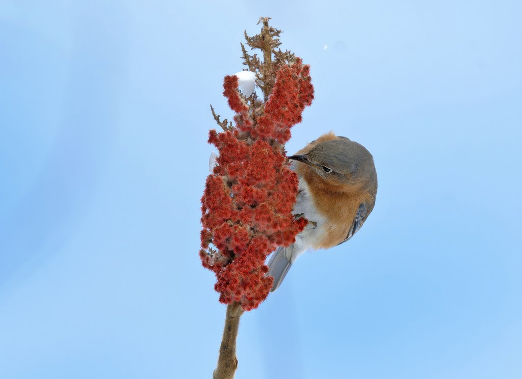 I took a walk into the woods this morning in search of a Fox den someone told me I might be able to locate. No luck there but when I saw these Robins feeding on the Sumac I hung around for a bit and was treated to a few Bluebirds that also seemed to be enjoying this plant. Along with one of my favorites, the Black-capped Chickadee.