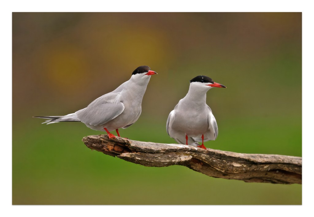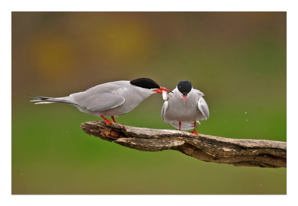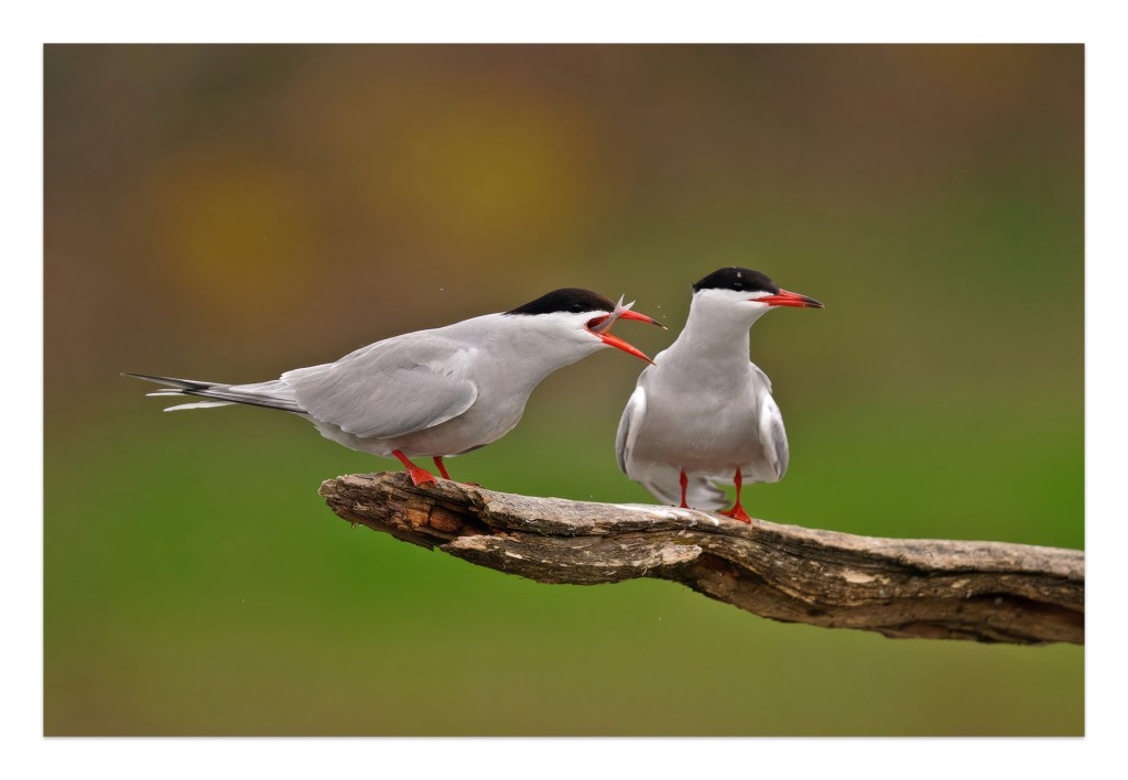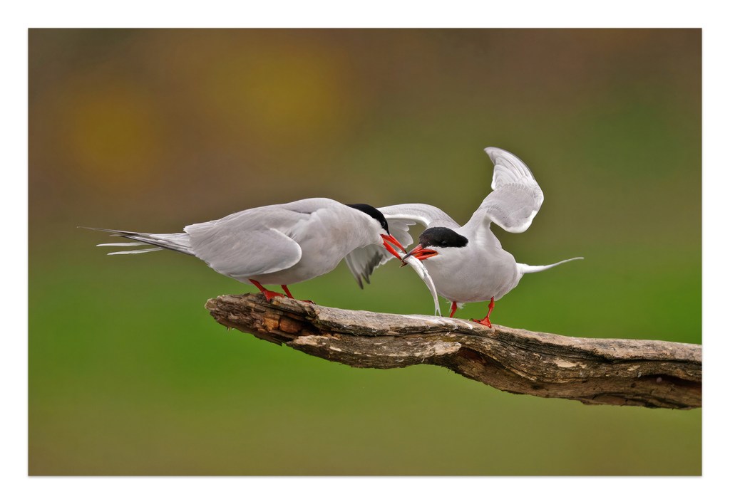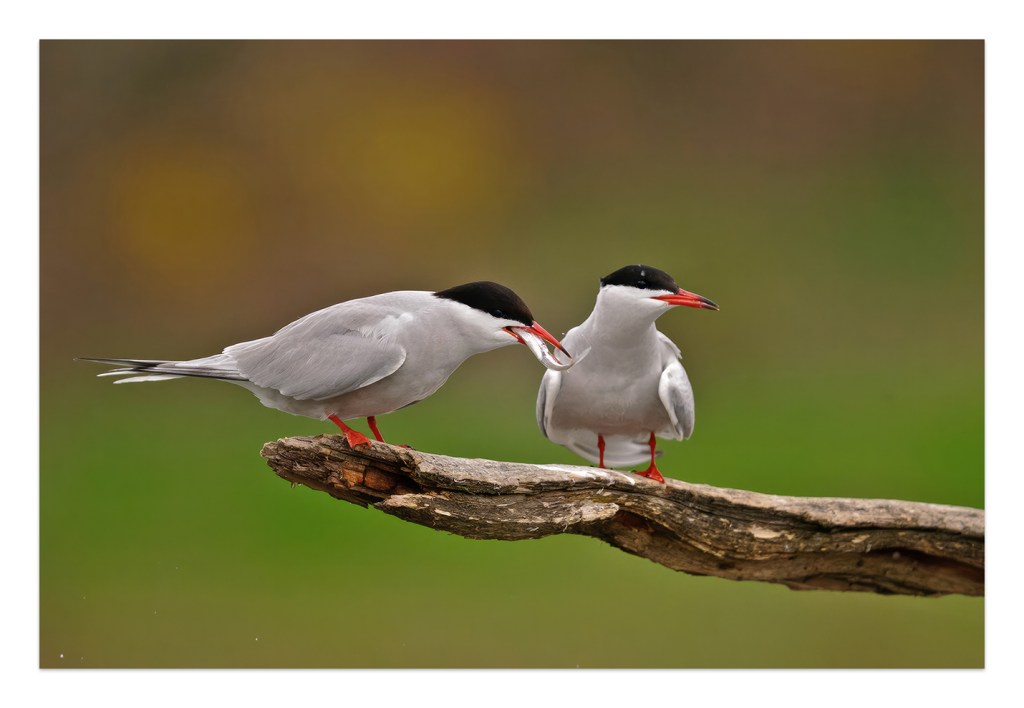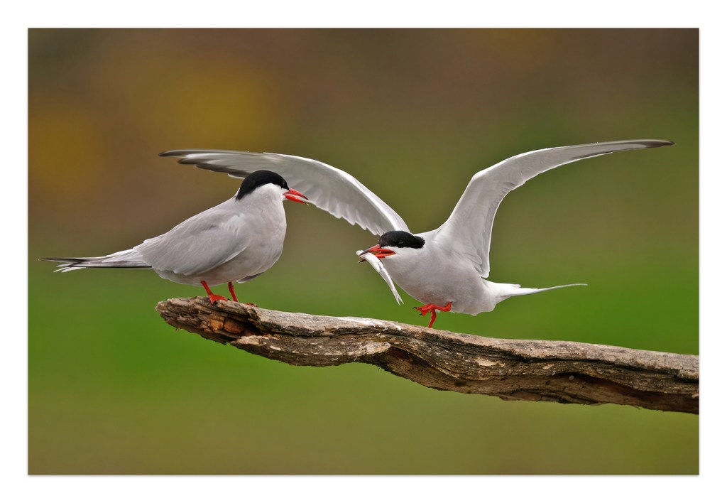 A male Common Tern delivers a fish to a female hoping to prove his worthiness as a mate.